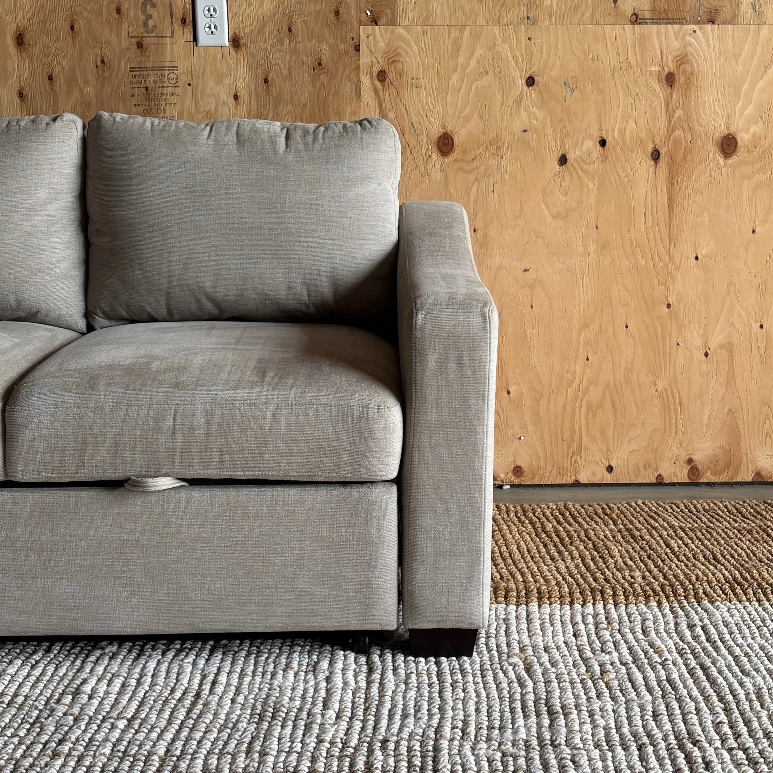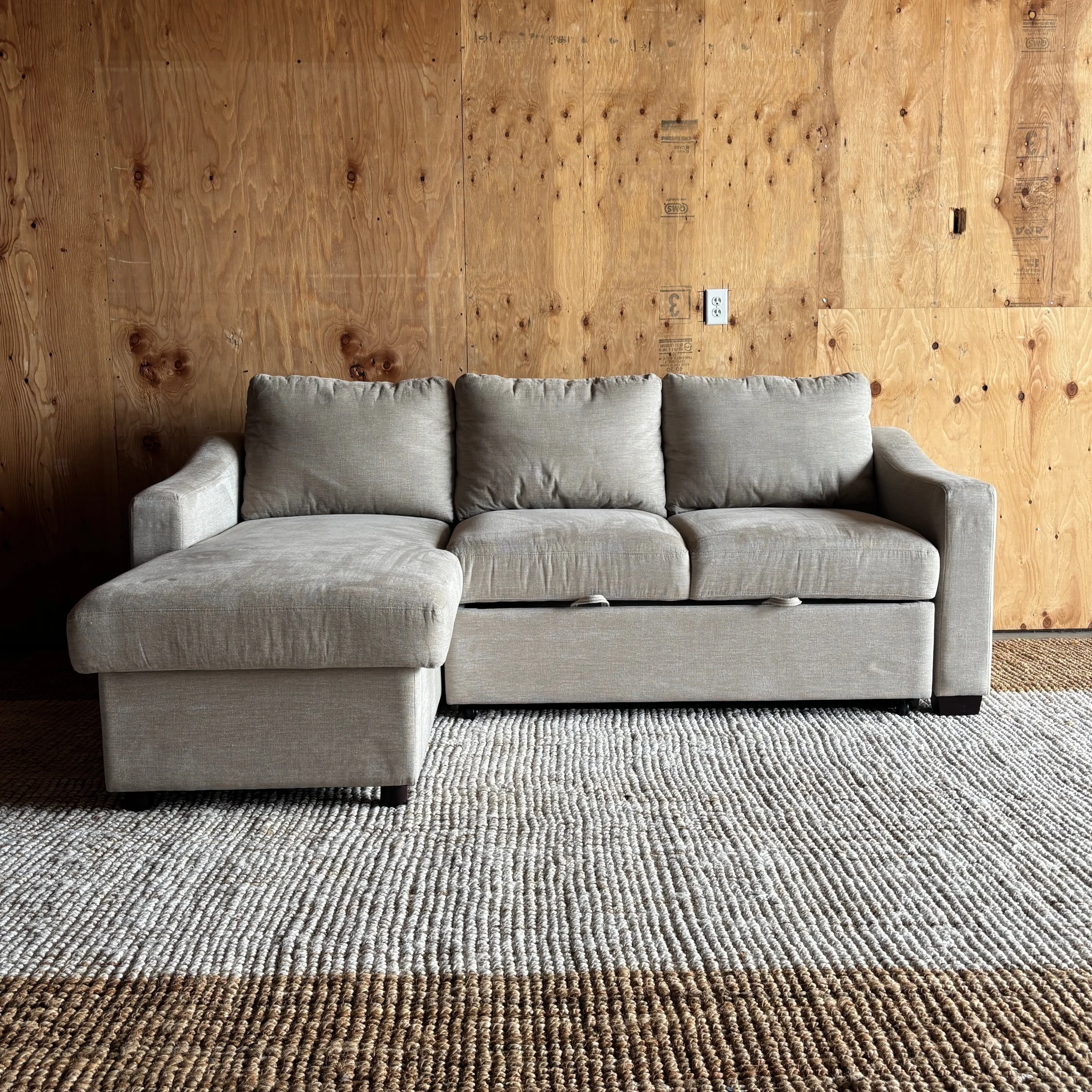 This is a sleeper sofa from Coddle with a reversible chaise, pull-out bed, and hidden storage under the chaise. It comes with a built-in charging station — two power outlets, one USB-A, and one USB-C. It's a practical option for anyone who needs a guest bed and everyday seating in one piece.