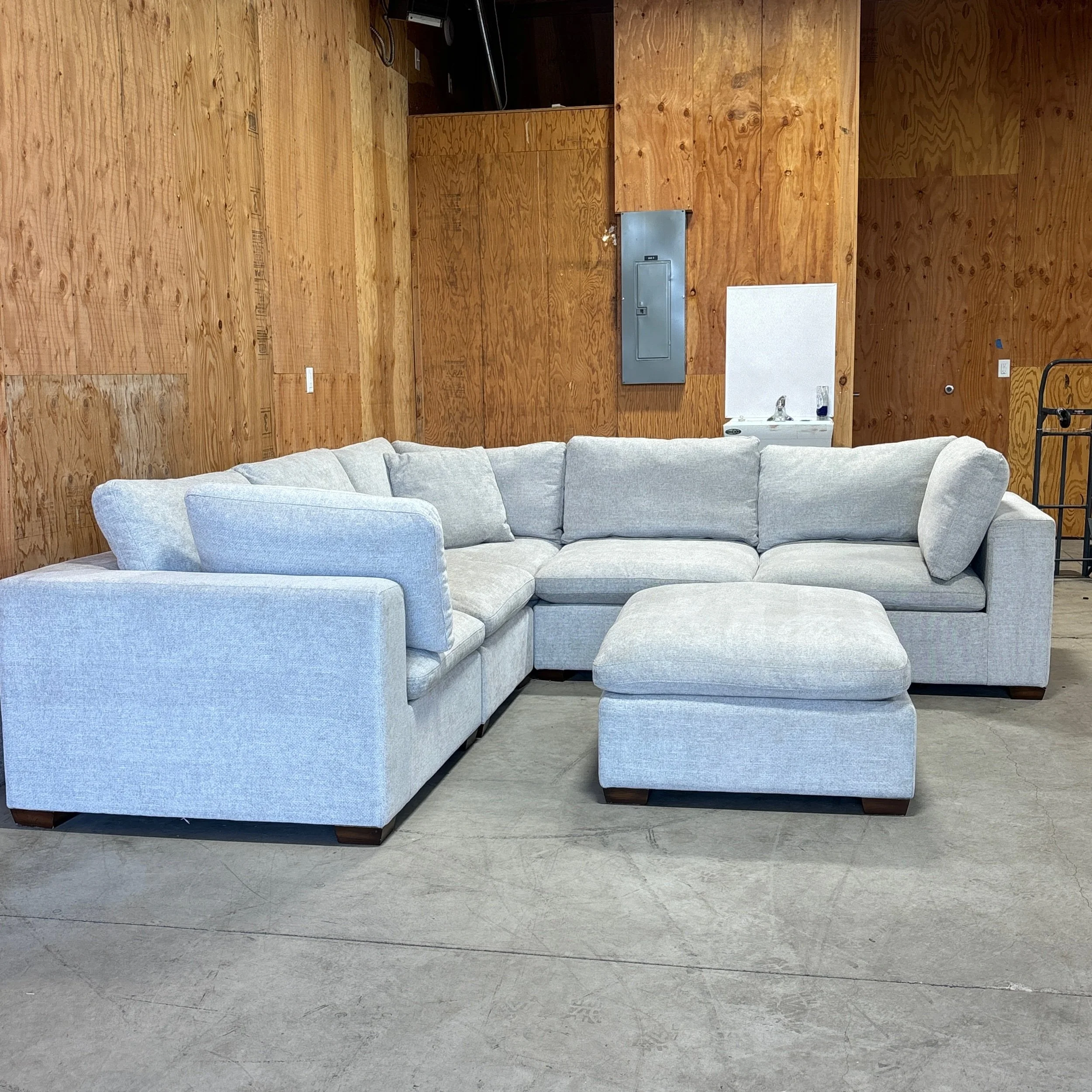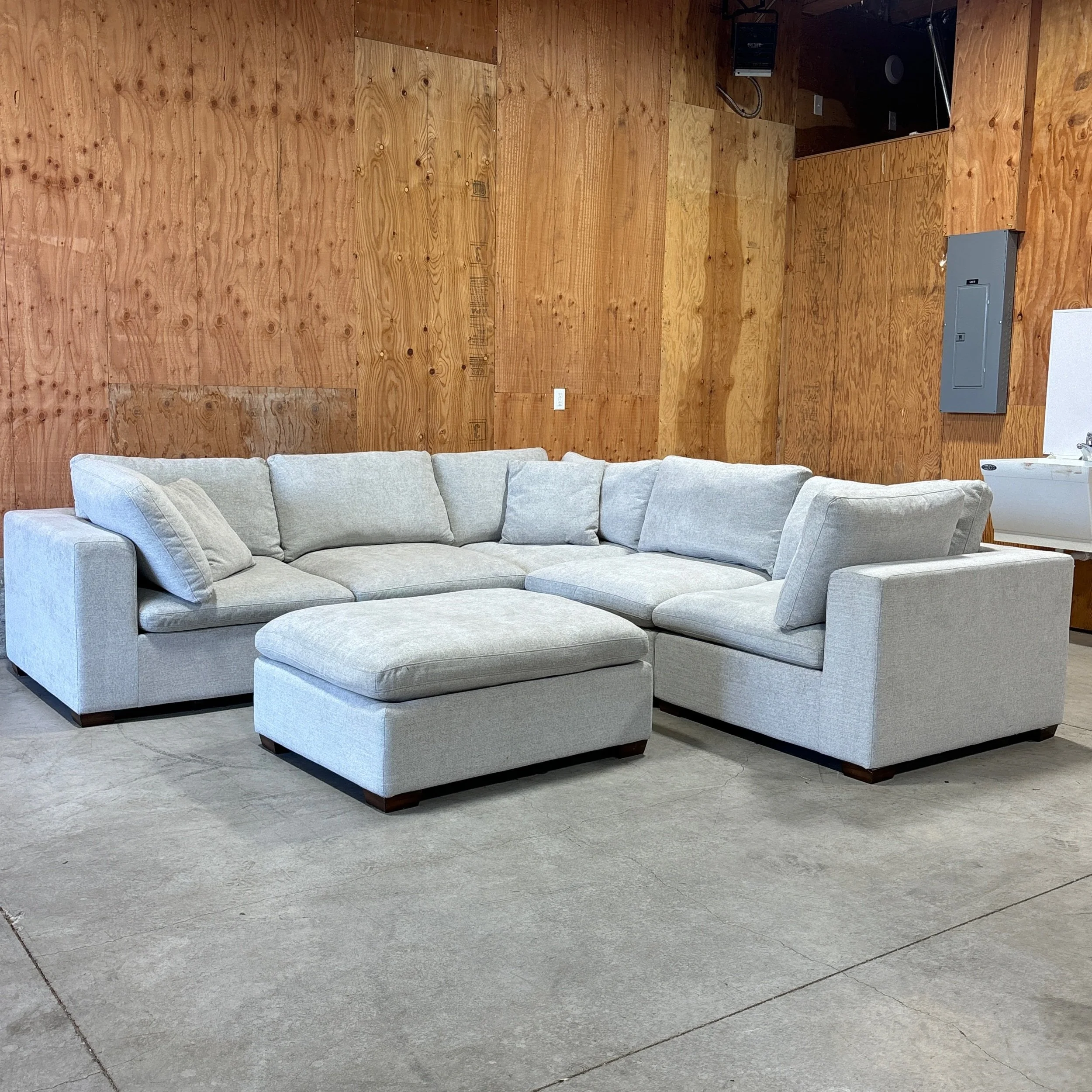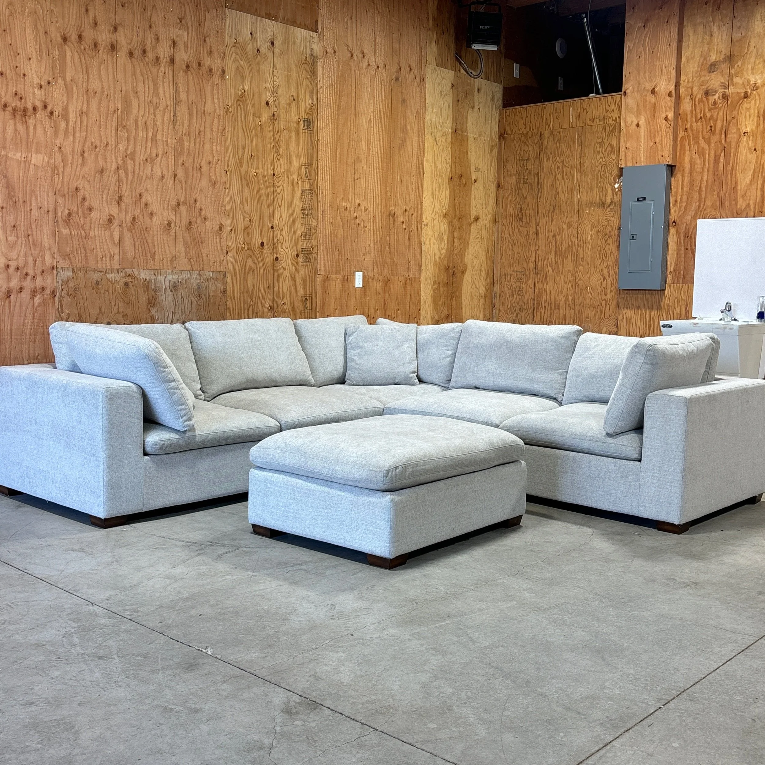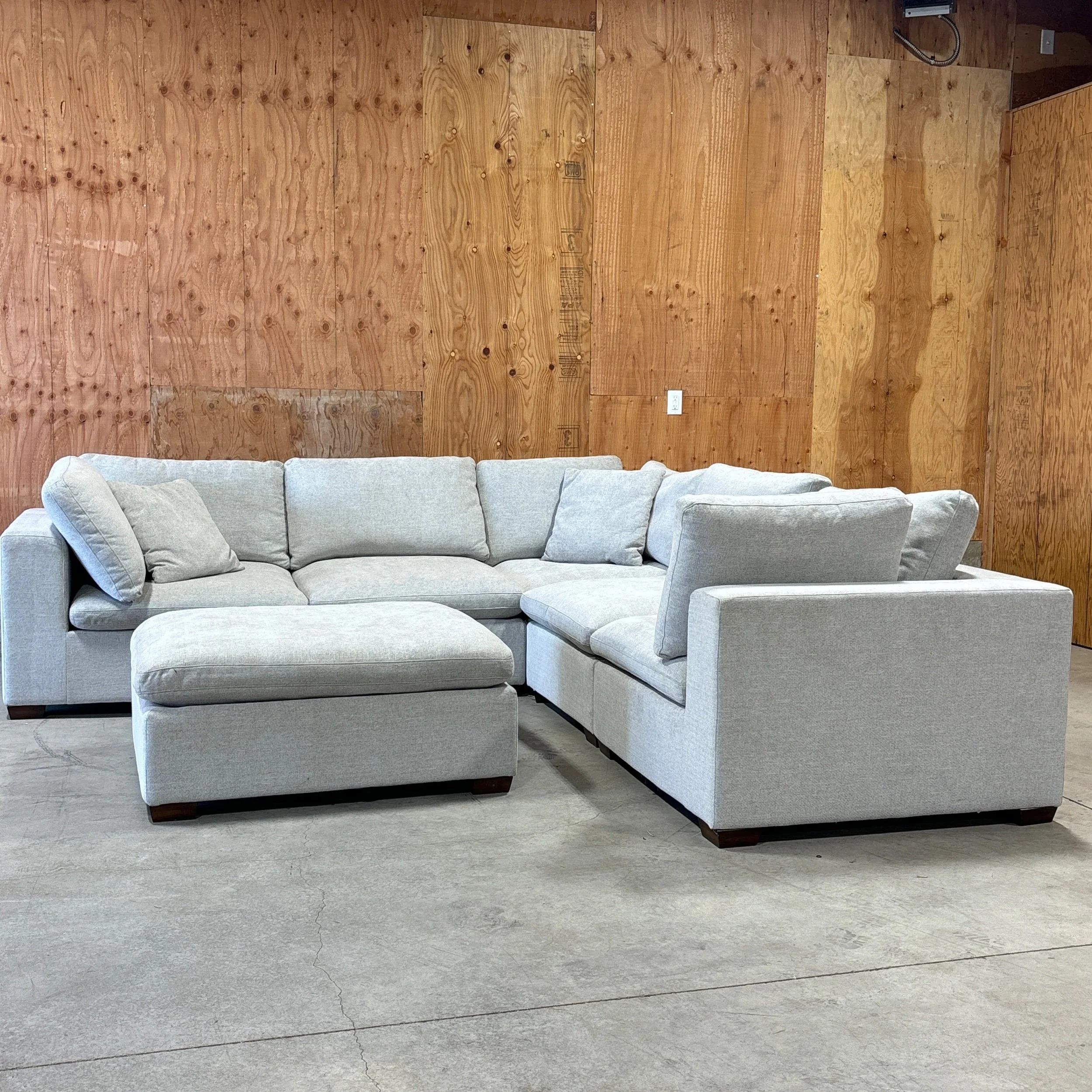 A spacious, sink-in-comfy modular sectional designed for larger living rooms, families, and entertainers. The Lowell features deep seats, reversible cushions, and a soft light gray fabric that fits seamlessly into modern spaces. Its 6-piece modular design (with ottoman) lets you create multiple configurations, whether you want a big U-shape for movie nights or a more open layout for gatherings.